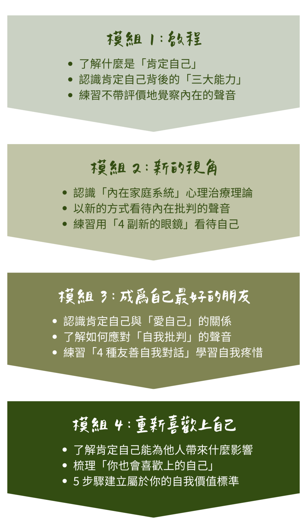 這門課的設計,以「肯定自己的挑戰」實作為主,輔以知識與額外學習資源,帶你從你自己實作的經驗中認識自己、體會其中的道理。